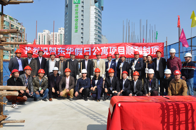 12月16日上午,隨著最后一車混凝土的澆筑完成,深圳市東華假日公寓工程主體結構順利完成封頂,施工現場,彩旗飄揚,掌聲雷動。深圳東華集團領導、項目建設合作單位漢京集團領導、施工單位恒泰基建設有限公司代表、合創監理有限公司領導在東華假日公寓頂層B區封頂處共同為公寓大樓封頂,共同見證工程建設開工以來最為激動人心的階段性成果,并紛紛致辭表示祝賀。