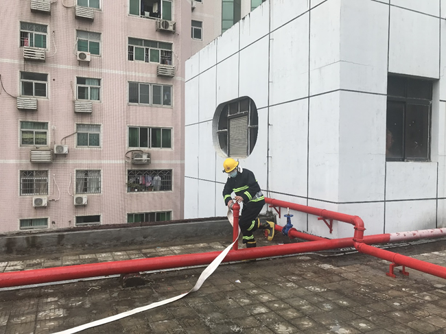 在消防安全實操演練中,義務消防員接到孵化器工業園8樓頂層“火警”通知后,三分鐘內按標準規范要求熟練穿戴好防護服,迅速進入“火災”現場進行撲救,后續支援消防隊員五分鐘內抵達“火災”現場進行援助,在做好“火災”撲救工作的同時,組織群眾迅速疏散。