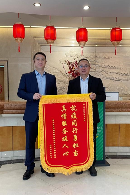 1月10日,深圳東華旗下東華假日酒店收到深圳市南山區防控新型冠狀病毒肺炎境外輸入工作專班送來的繡著“抗疫同行勇擔當 真情服務暖人心”的錦旗和感謝信,深圳東華黨委副書記、董事、總經理劉立基代表公司接受工作專班負責人陳華巍局長贈與的錦旗。