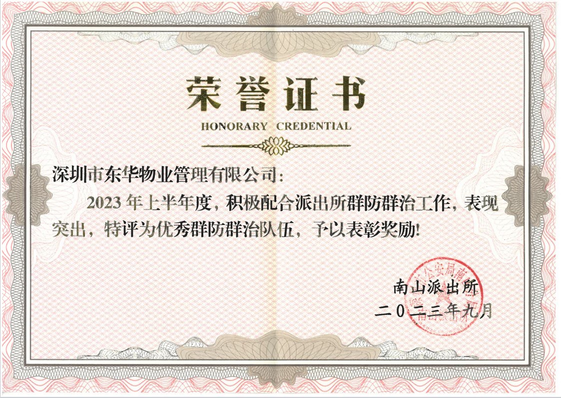 9月22日,南山派出所召開2023上半年群防群治隊(duì)伍管理工作會(huì)議,東華物業(yè)公司因?qū)ι鐓^(qū)安全和秩序的杰出貢獻(xiàn)被評(píng)選為“優(yōu)秀群防群治隊(duì)伍”。