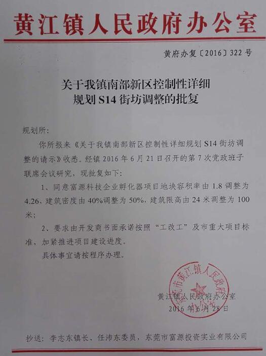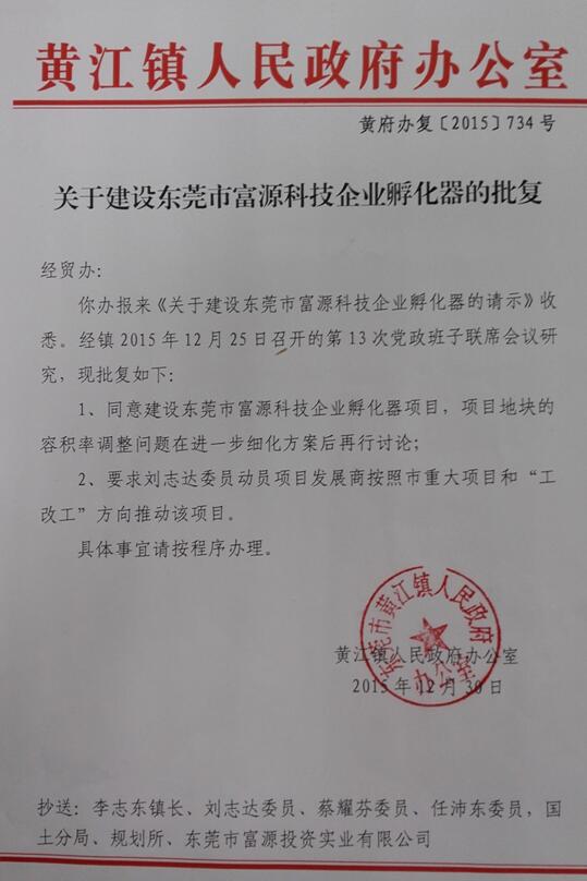 于2015年12月30日得到黃江鎮(zhèn)同意。經(jīng)鎮(zhèn)2015年12月25日召開的第13次黨政班子聯(lián)席會研究,同意建設(shè)東莞市富源科技企業(yè)孵化器項(xiàng)目,項(xiàng)目地塊的容積率調(diào)整問題在進(jìn)一步細(xì)化方案后再行討論;要求劉志達(dá)委員動員項(xiàng)目發(fā)展商按照市重大項(xiàng)目和“工改工”方向推動該項(xiàng)目。