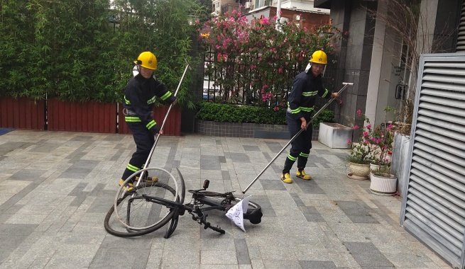 演練模擬充電樁處電動(dòng)車(chē)突發(fā)起火場(chǎng)景。火情發(fā)生后,值班保安迅速反應(yīng),第一時(shí)間趕赴現(xiàn)場(chǎng),切斷電源,隔離群眾。保安員迅速取來(lái)消防鉤,根據(jù)要求,將著火電動(dòng)車(chē)從充電樁處拉拽出來(lái),與周邊電動(dòng)自行車(chē)隔離,防止火勢(shì)蔓延。與此同時(shí),其他保安迅速提起滅火器,對(duì)準(zhǔn)火源根部噴射滅火。在團(tuán)隊(duì)緊密協(xié)作下,短短幾分鐘,明火被成功撲滅。