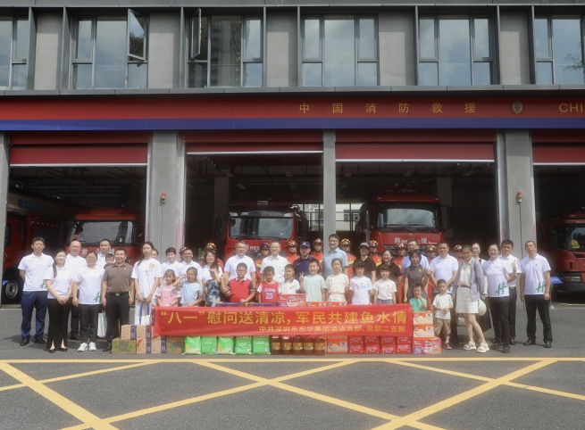 為慶祝中國人民解放軍建軍98周年,大力弘揚雙擁光榮傳統,8月1日上午,山東發展集團所屬深圳東華假日酒店支部與總部二支部前往深圳市南山區南園消防救援站開展“送清涼”慰問活動,深圳東華黨委副書記王磊以普通黨員身份參加活動。